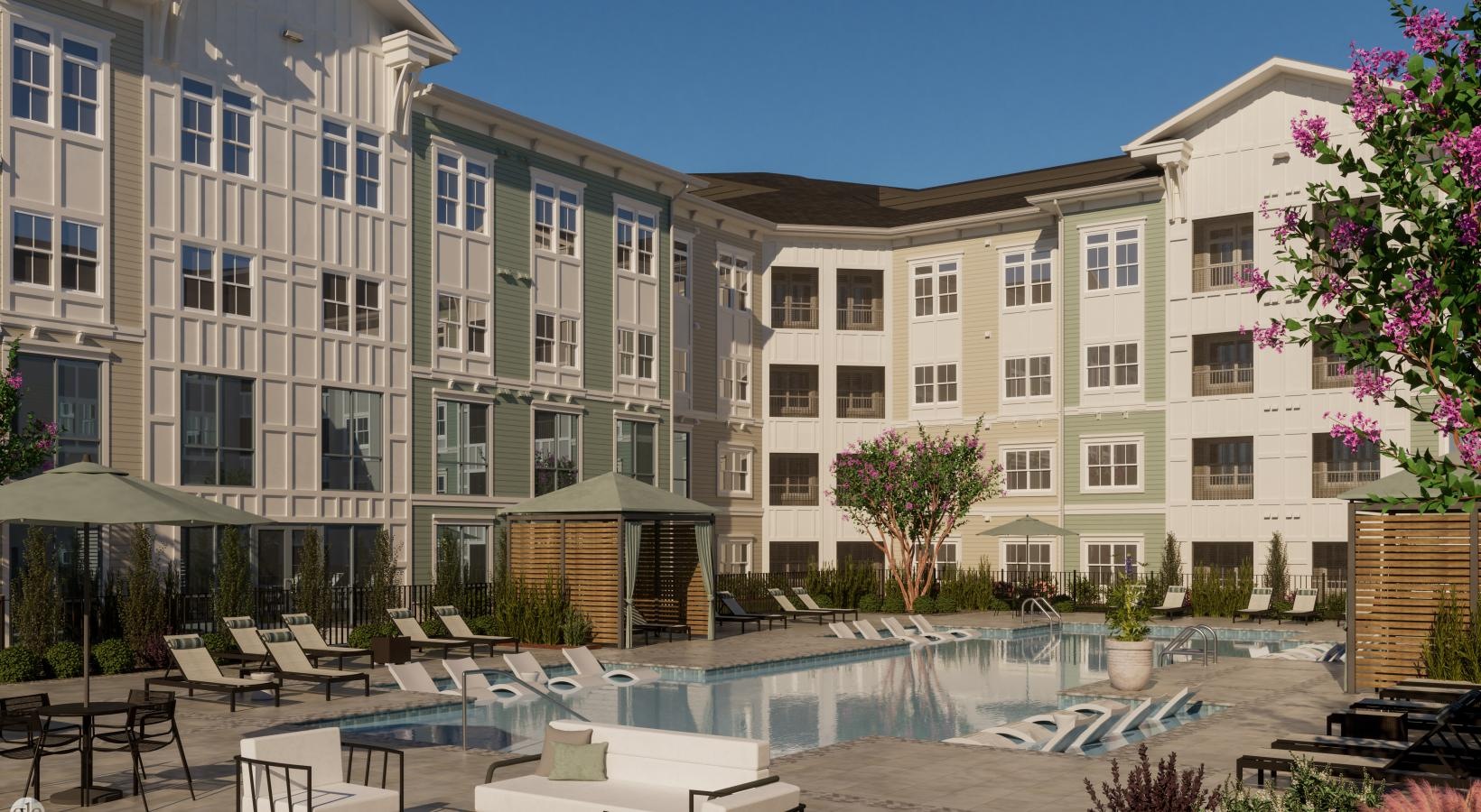 • a courtyard with a pool and lounge chairs
