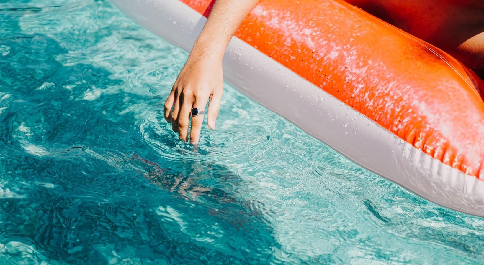 • woman dangles her hand in the pool as she floats in an inflatable vessel