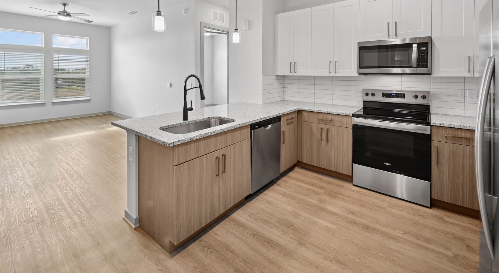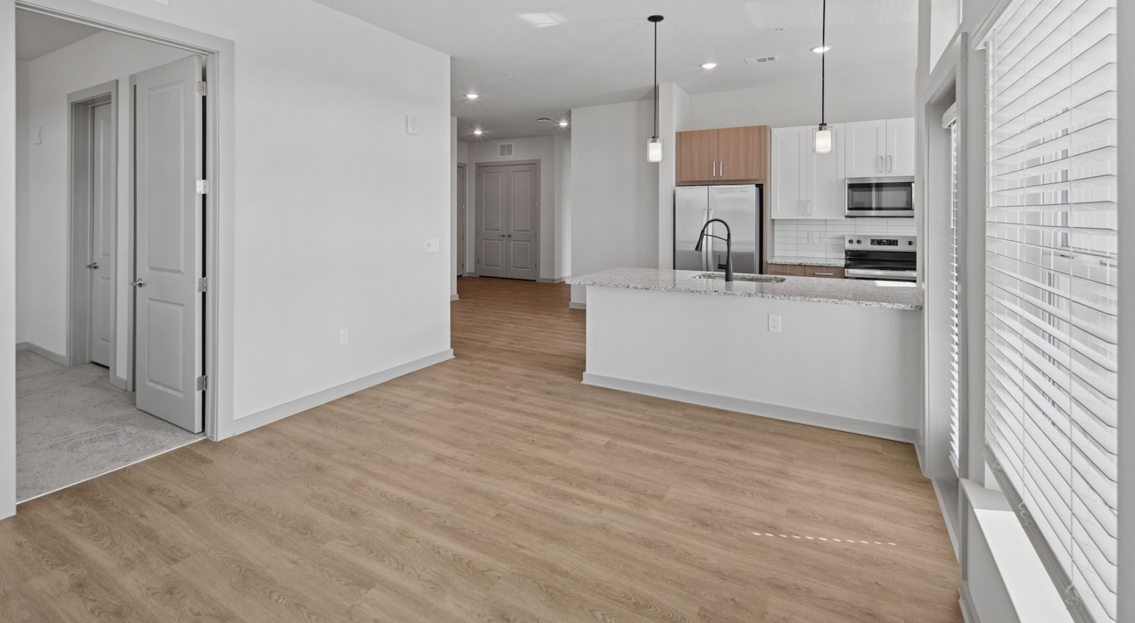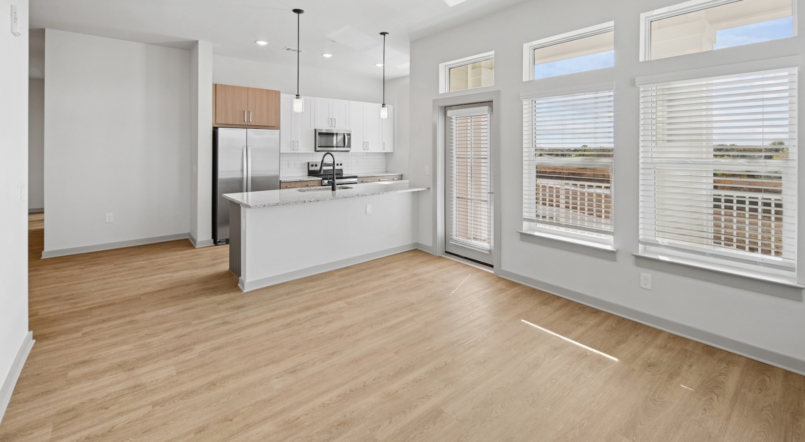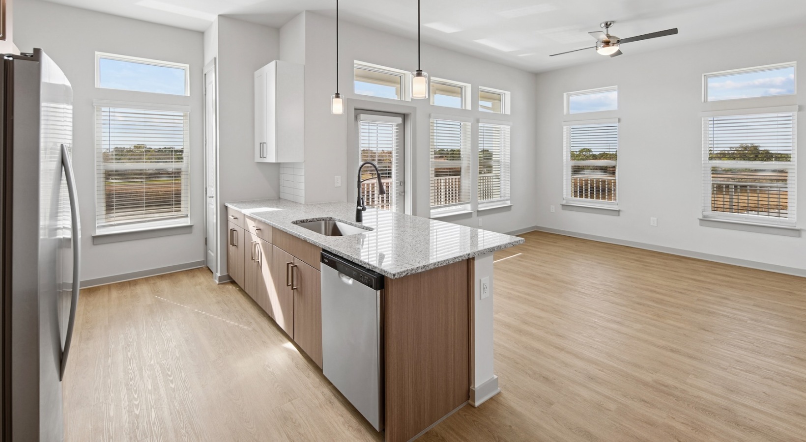 • a living room and kitchen with windows