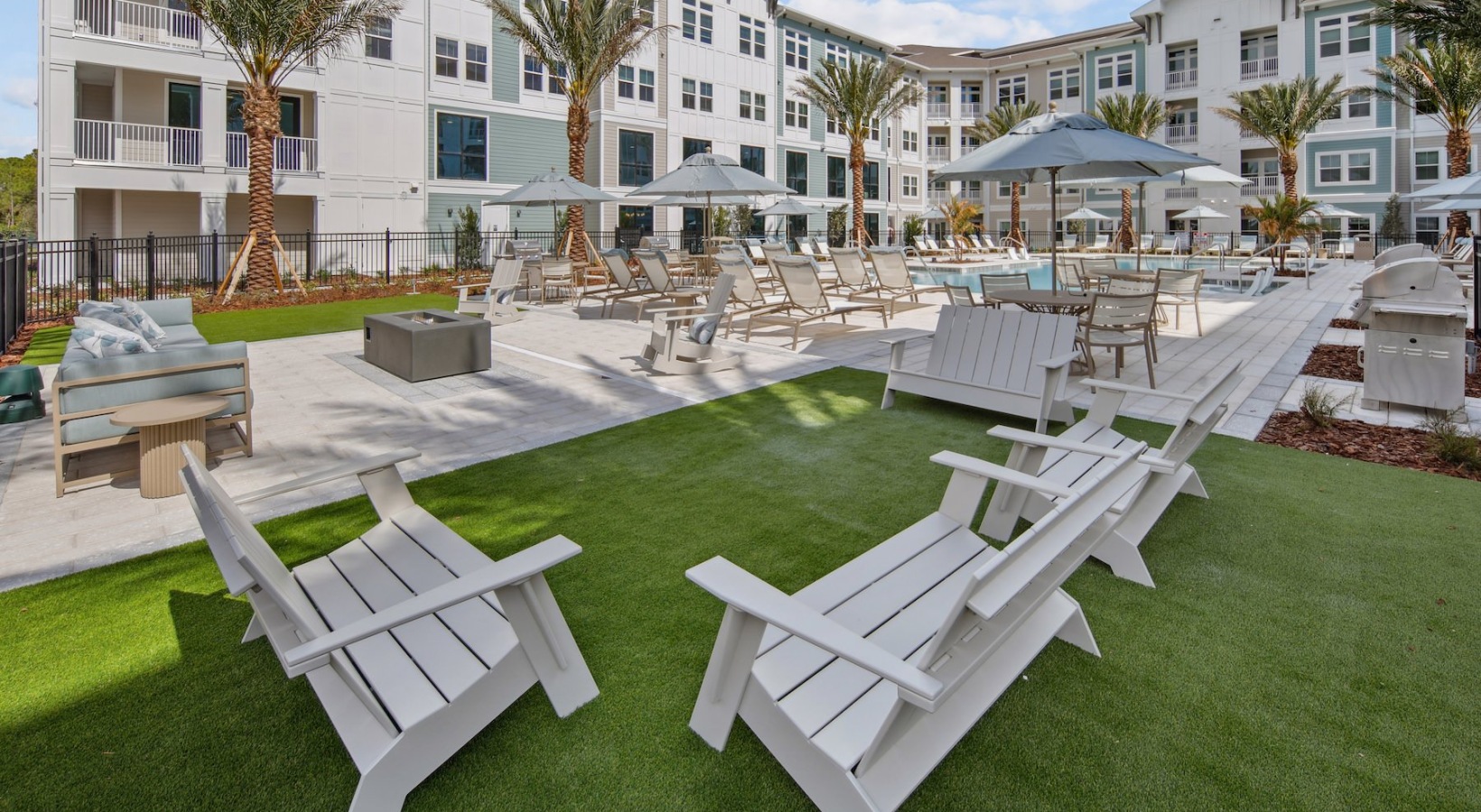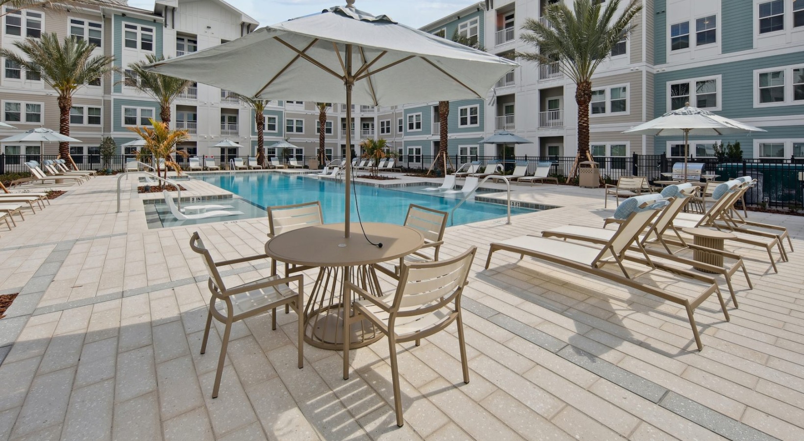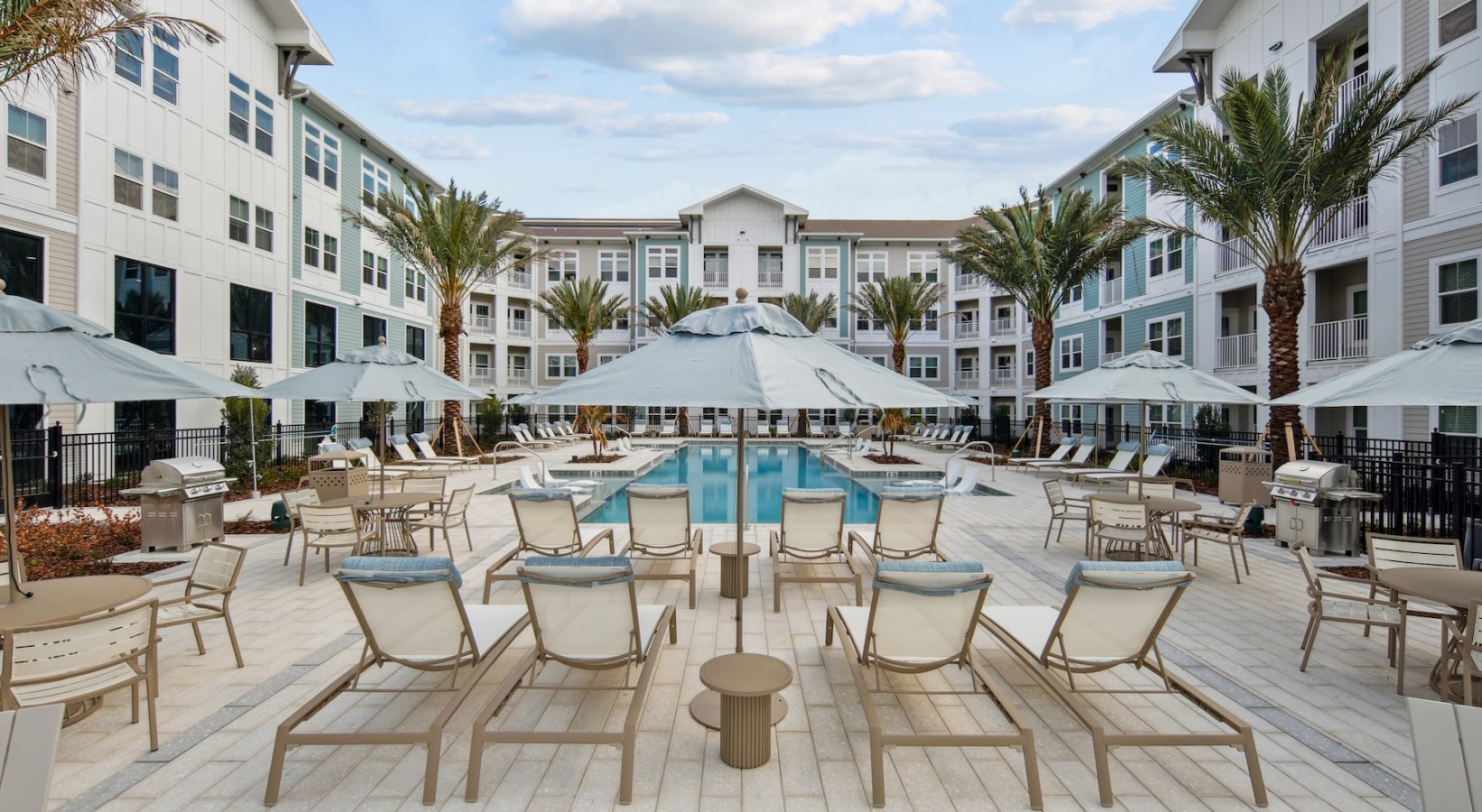 • a courtyard with a pool and palm trees