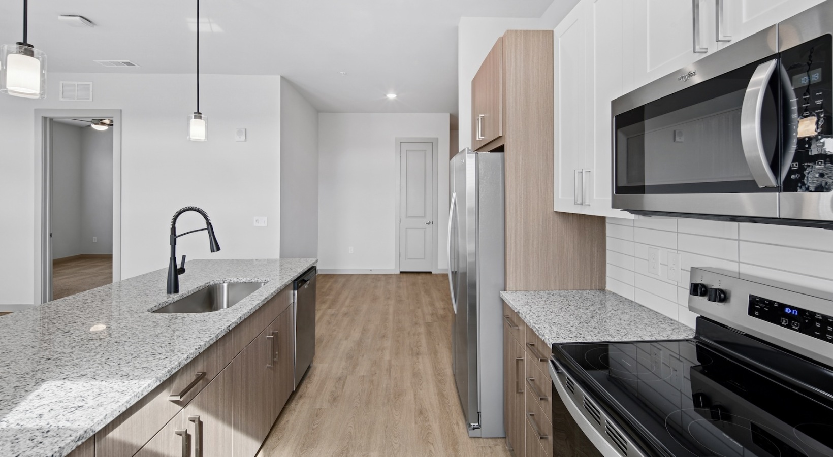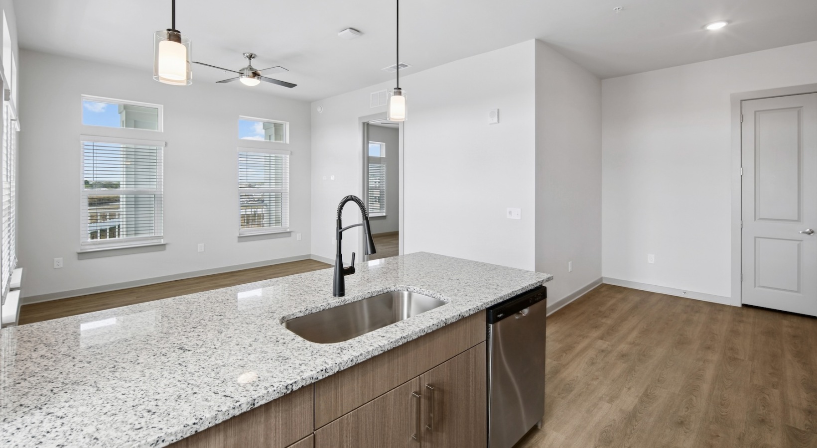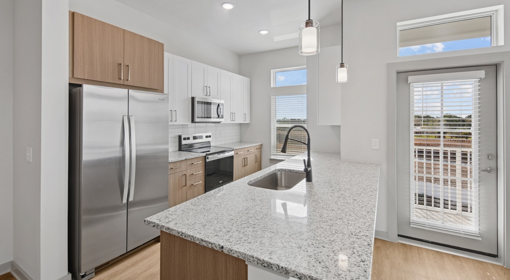 • a kitchen with an island and windows